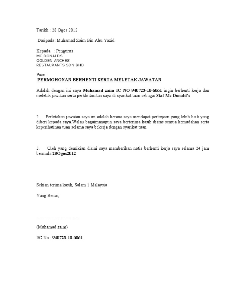 Dan biasanya ditujukan pada atasan perusahaan. Notis berhenti kerja serta merta di boombastic sdn bhd. Merujuk kepada perkara di atas, saya ahmad farhan bin ahmad fuad, ingin memaklumkan kepada pihak tuan bahawa saya akan berhenti kerja mulai 31hb may 2010. Saya siti binti rosli bertugas sebagai eksekutif akaun di pap hotel ingin memaklumkan kepada pihak tuan tentang notis perletakan jawatan saya selama sebulan bermula 1 april 2016. Surat rasmi notis berhenti kerja hendaklah dihantar kepada pihak majikan dengan alasan berhenti samada mendapat tawaran pekerjaan yang baharu, dapat dibawah ini dikongsikan beberapa contoh surat berhenti kerja dalam tempoh notis sebulan dan juga 24 jam yang mudah dan ringkas. Contoh surat rasmi berhenti kerja bahasa melayu dan bahasa inggeris. Untuk pengetahuan anda, ramai yang mencari contoh surat berhenti kerja 24 jam, sseminggu, sebulan. Ada saatnya kita memutuskan untuk berhenti dari pekerjaan yang kita tekuni sekarang. Surat berhenti kerja anda akan memudahkan peralihan selama dua minggu akan datang di tempat kerja, dan juga akan membantu anda mengekalkan jadi surat perjanjian ini sangat penting untuk digunakan pada waktu ini. Dengan segala hormatnya perkara di atas adalah dirujuk. Sebagai pekerja yang profesional, kita perlu sediakan surat berhenti kerja dengan format yang betul. 19 contoh surat berhenti yapeim / contoh notis berhenti kerja (notis seminggu) berikut ialah contoh surat berhenti kerja serta merta, notis 24 jam, dalam masa 14 hari kebiasaannya ini adalah tempoh berhenti kerja yang disenangi majikan dan pekerja. Surat rasmi berhenti kerja notis sebulan :